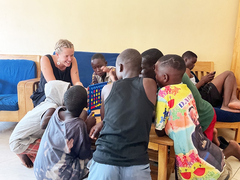 Friday Jade and I went back to Garuga as Kasita and Johnson have both returned. Tresor arrived with Kodet, Sula, Victor and Saviour so nearly a full house. Jade played Jenga and Connect 4 most of the afternoon. I taught young Denis how to sew and mend one of the chair cushions. We returned again on Saturday afternoon to pack the car with mattresses, craft activities and games for the camp as Ian is taking my car and driving to Mbarara on Monday to meet us at Lake Mburo on Tuesday. We took the young boys swimming whilst the older ones watched football on the television.